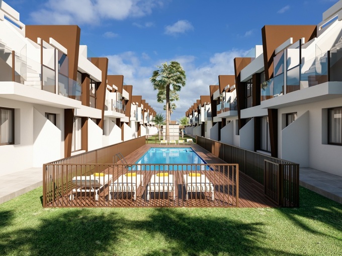 NEW BUILD bungalows IN SAN PEDRO DEL PINATAR/ Lo Pagán with a communal swimming pool, terrace/sunroof and parking space within the plot or next to steps. Each property has 2 bedrooms and 2 complete bathrooms, open plan kitchen with spacious living room, fitted wardrobes. San Pedro del Pinatar's privileged location on the Mar Menor and Mediterranean coastline it attracts those with an interest in sailing and water sports, providing marina mooring and sailing clubs, while the beaches and natural mud baths attract those seeking safe sun, sea and sand. San Pedro del Pinatar has an established community and offers an excellent range of activities, including covered swimming pool and sports facilities, as well as a year round programme of social activities by the pleasant winter weather. Heated pools are located just in 4 kms distance. The benefits of the mud baths, typical of the region, or the calm waters of the Mar Menor, have favoured the growth of Lo Pagán, which currently has all kind of amenities. In addition, it has an excellent location, just 5 minutes from the Comercial Center Dos Mares.
